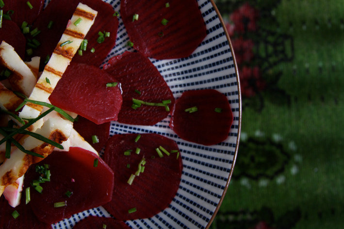 Halloumy hiding, halloumy cheese on a bed of garlic-boiled beetroat and parsley