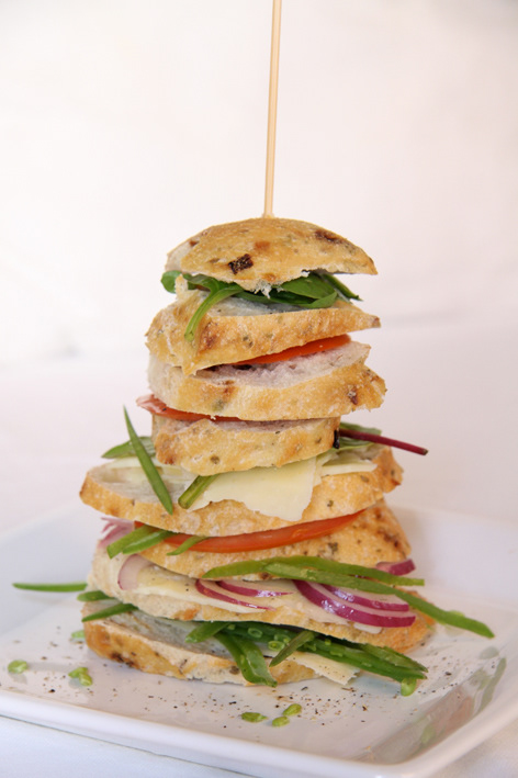 Emipre, 8-floor sandwich with cheddar cheese, tomato, red onion and ruccola