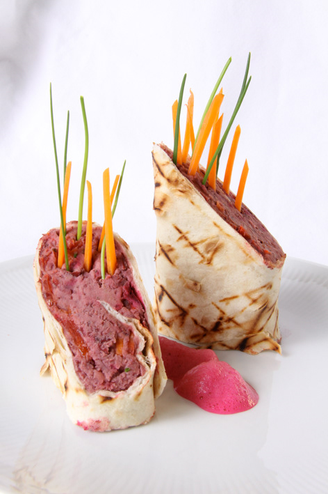 Wrap Your Arms Around Me, tortilla filled with beetroat, chickpeas, onion, carrots and cumin.