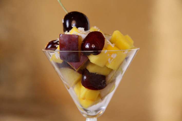 Fruit del Montes, fruitsallad with peaches, grapes and plums.
