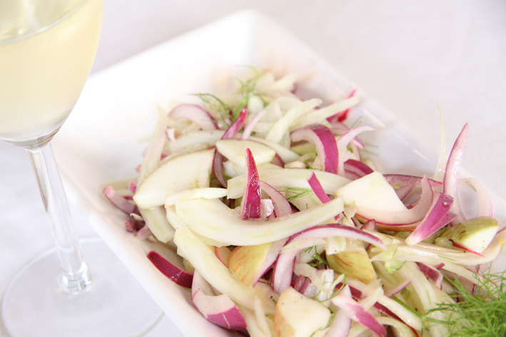Pale Fresh, cold salad with fennel, red onion, apple, sprinkled with olive oil.